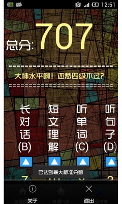 此应用主要功能用于计算四六级的成绩,通过官方网站的计算公式,准确计算四六级分数,把一套试卷从百分之转换成710分制,这样可以准确了解自己四六级英语的水平,应用分四级和六级两个页面,分别计算各自的分数。对于当前准备四六级的同学们很有用的一款软件!