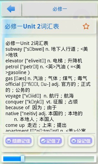 英语词汇记忆(高中人教版)是一款由天渔教育研发的高中英语词汇记忆软件,针对的是人教版的高中英语用户从必修一到选修十一共55个单元的词汇表在这里都可以找到,并且每个单词都有标注音标让您记单词事半功倍可根据学校学习进度制定学习计划神奇的收藏夹,方便您收录重点词汇,随时随地学习、记忆