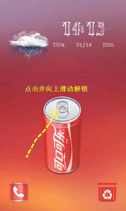 趣味锁屏通过点击图中的可乐罐开口处并向上滑动即可解锁到桌面,解锁的同时还伴随着可乐喷出的小动画哦,看了太多常规的解锁,不如来试试这款锁屏哦,一定会带给你不一样的感受。本锁屏还可显示时间、日期、星期、电量等,还带有九宫格解锁和数字解锁的功能,为你手机的安全保驾护航,更多设置等你来使用哦!!!