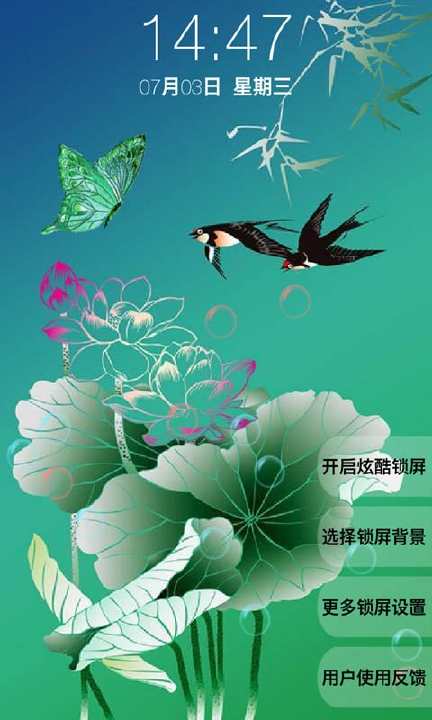 一款非常实用的荷塘月色炫酷解锁软件,功能非常的强大,把它装在您的手机上,让您的手机更加与众不同,保证让你爱不释手哦! 你可以DIY设置自己想要的桌面背景,3D的滑动切换效果,也可以从手机相册中选择,还添加了宫格解锁等多功能。还有迷你动画,喜欢它吗?那还等什么呢?赶快来体验一下吧!一定不会让你失望!