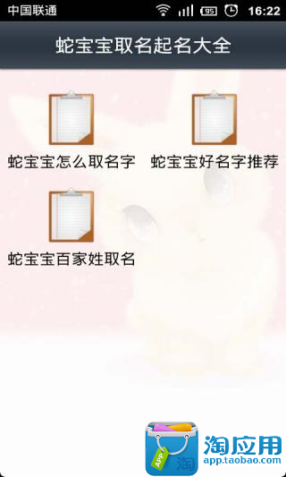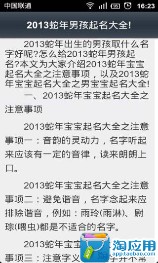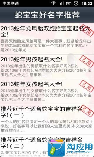 名字虽然不能决定一个人的命运,但是一个好名字凝聚着父母对孩子的深情厚意和殷切期望,隐寓着不同的理想抱负、情趣、爱好与目标追求,它对人生起着潜移默化的作用。如何给2013年出生的蛇宝宝取一个好名字呢?本应用详细为你介绍...