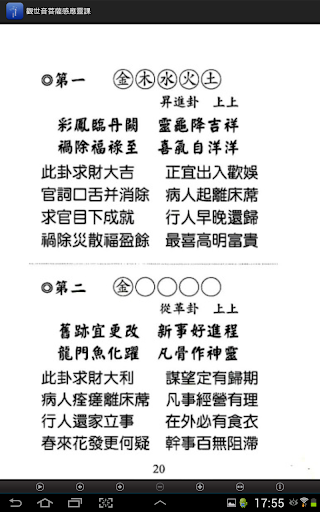 欲決疑者,若原供有菩薩像,則於像前焚香禮拜;若無,則即向此課本焚香禮拜。取五淨錢,將香煙上熏過,心中默禱所問之事,按下列之偈,并念菩薩若干聲。將錢在手中搖幾搖,令其次序散亂,然後擲於桌上;按次是幾字幾幕,照課本查是何卦,即得其所示之兆云。