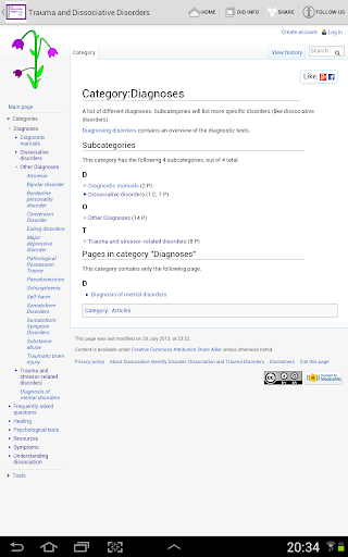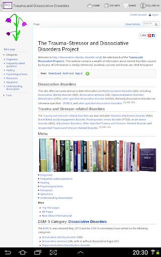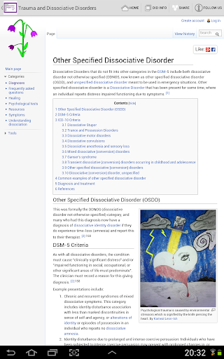 主页在中国。其他网页中的英文。本頁主要提供解離症(Dissociative Disorders)的資訊,包括:解離性身份疾患 (Dissociative Identity Disorder,DID)、 解離性失憶症 (Dissociative Amnesia,DA)、自我感喪失症(或稱人格解體障礙)(Depersonalization Disorder)/現實感喪失(或稱失實障礙,Derealization)、其他特定的分離性障礙(Other Specified Dissociative Disorder,OSDD)(舊稱「其他未註明的解離症」,即Dissociative Disorder not otherwise specified,DDNOS)及未特定的解離症/未特定的分離性障礙(Unspecified Dissociative Disorder)。在1970及1980年代,我們對於童年受虐待經歷的長遠、殘餘影響,所知甚少,但近年已經有很多研究開始關注這個問題。儘管施虐者竭盡全力去隱藏自己曾對兒童所作出的情感、身體或性虐待,但事實是,虐待兒童仍很常見,而且也是人類文化中可怕、隱藏的流行病。