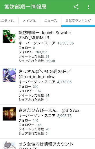 クラスタ内を盛り上げるためにツイートや話題を提供しているユーザーを、シェアされた回数や影響度に応じて、相対的に貢献度をランキングします。ランキングは数時間ごとに更新されます。