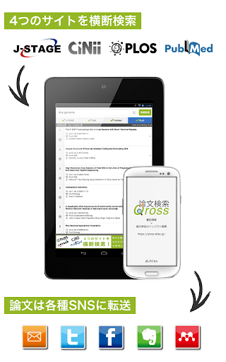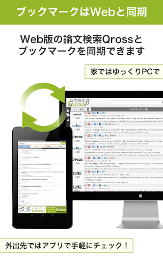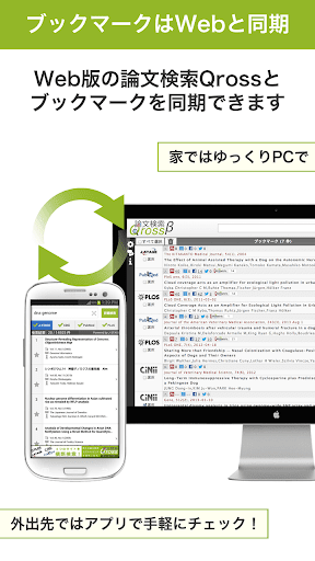 また、Web版論文検索Qross(https://qross.atlas.jp/)と連携してブックマークを共有すれば、外出先で携帯端末でブックマークした論文を、家でじっくりPCで確認できます。