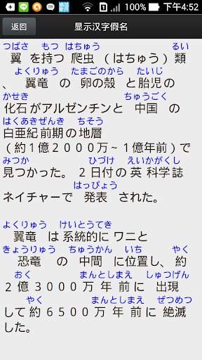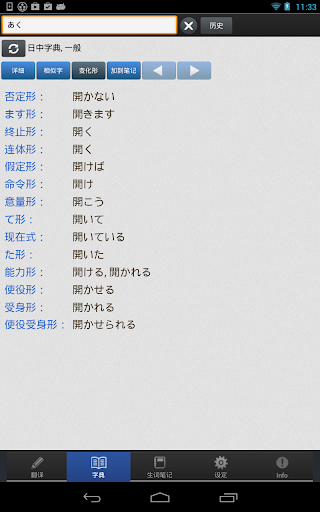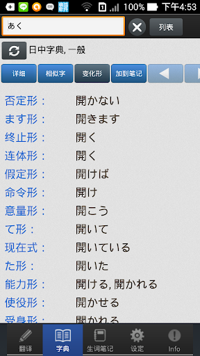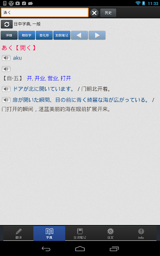 查询内容丰富的日、中字典,内含25万词条。除了字词的详细解释,还显示前后字列表。