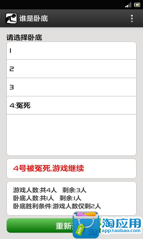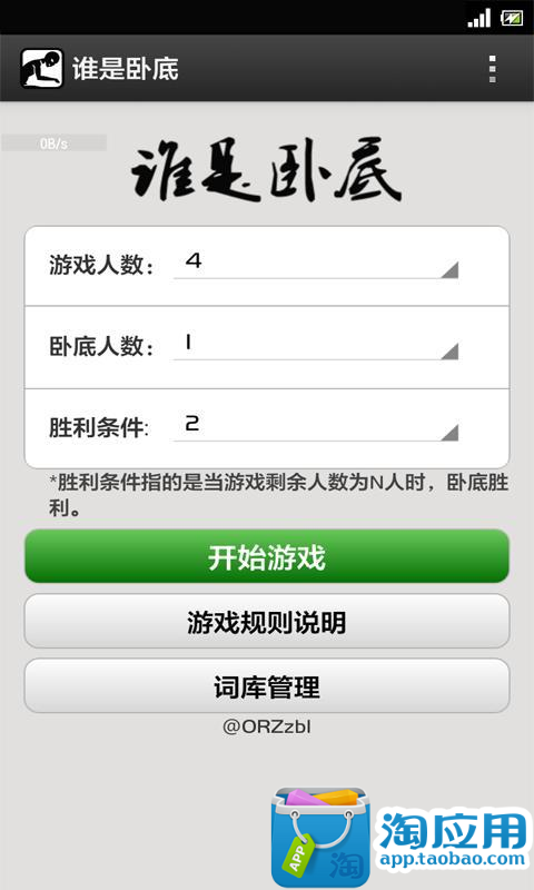《谁是卧底单机版》是一款休闲桌游,是一个非常有趣,风靡全国的比拼语言表述能力、知识面与想象力的游戏,多人聚会聚餐时的首选欢乐游戏。 《谁是卧底单机版》具有自定义游戏玩家、自定义卧底人数、自定义身份词、词库管理(添加、修改、删除身份词)等功能。 玩法说明: ①玩家坐在一起,每人排个序号(1、2、3……),根据需求设定游戏人数、卧底人数、胜利条件。 ②点击“开始游戏”,序号1的人拿到手机点击“查看”查看自己的身份词。记住身份词后点击“记住了”,将手机传给下一位。 ③所有人看完自己的身份词后,按顺序每人描述自己的词语,既要给同伴暗示,也要不给卧底发现改词语。 ④根据自己的判断投票认为谁是卧底,最后查看票数最多者的身份。如果不是卧底,则继续新一轮的描述,直至卧底全被找出或者卧底达到胜利条件。 【更新内容】 v 1.0.1更新内容: 1:修复需要重复设定人数的Bug。 2:更新词库(如果是覆盖安装,请在词库管理选择"恢复默认")。 3:使用新的程序逻辑。