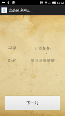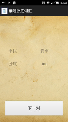 你喜欢玩快乐大本营里的谁是卧底的游戏吗?那你找对地方了。你只要摇一摇手机,它就会帮你选出一组词汇。这款词汇拥有500多组词,让你永远不用担心玩游戏时出现词穷-