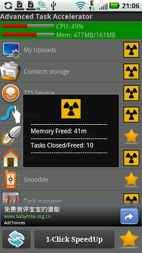 It is pretty simple. Open this tool and take a look at the running processes? Uncheck some processes you don't want to be closing/restarting(such as battery manager process) Tap the button '1-Click SpeedUp', It will closing/restarting all processes that have 'nuclear' sign.