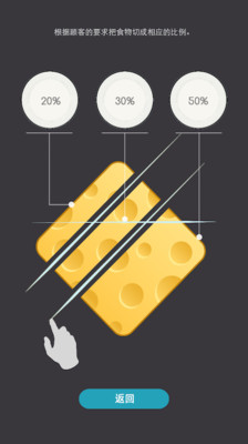 今天你带上了厨帽,开始服务你的食客。食客的要求很简单,他们会告诉你他们需要食物的分量,而你就是按照这个分量把食物切给他们。你的刀法越精湛,你就会得到越多的奖励。