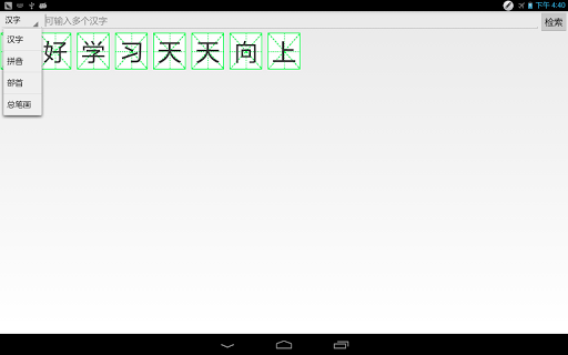 另外,本软件还带有查询汉字的功能,可以通过部首,总笔画,拼音多种方式对汉字进行分组和查找,及趣味性和学习性于一体,也可当作一本词典来使用,特别适合正在学习汉字的小朋友。