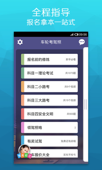 车轮考驾照-驾照考试(适用全国的驾考宝典)包含了驾考中科目一、科目二、科目三、科目四的全部内容,该应用严格遵守《2014年新机动车驾驶教学与考试大纲》的教学要求,免费为考驾照的朋友们提供全方位的备考资源与帮助