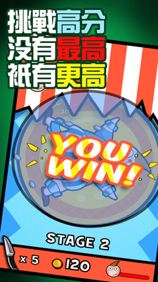 每关会有不同的标靶数,标靶也会出现在不同的位置,只要打落所有的标靶,就算过关。轮盘会不停的加快,卷帘也会不时的给你捣乱,好好锻炼你的准心吧!犹记得那个“xx飞刀,例无虚发”嘛?也一直在羡慕那些蒙眼还能射中靶心的超人吧,现在也让我们亲身体验下射飞刀的乐趣,赶紧来加入。