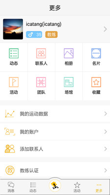 实时聊天功能,“动态”功能可以记录运动数据并分享运动状态,支持动态同步分享到微博、微信、人人。