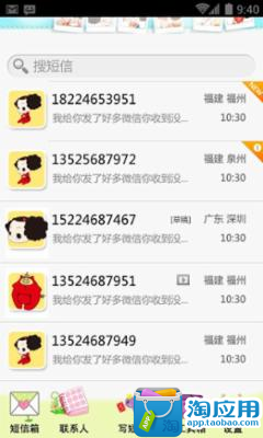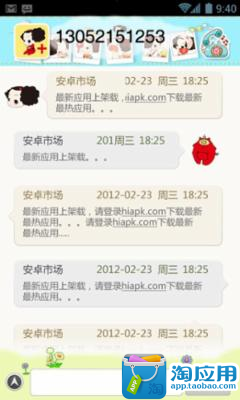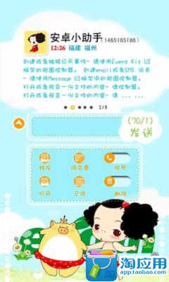薄荷系的迷糊娃娃给你带来清凉一夏。应用于安卓短信的主题,已包含了最贴心最好用的安卓短信。安卓短信是“比系统自带短信功能更好用的”免费短信增强软件,他荣获2011-2012中国最佳移动应用产品大奖。酷炫的来信弹窗、摇摇换肤、网络铃声下载、定时短信、情景式表情聊天乐趣不断;私密箱,黑名单贴心保护你的信息安全。节日祝福、贴心关怀、人生格言、浪漫爱情、整蛊搞怪,短信广场每日更新并能免费订阅,让你成为最耀眼的短信明星!