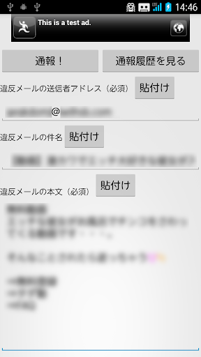 1.ユーザー様がアプリに迷惑メールの内容を入力し、「通報!」ボタンを押します