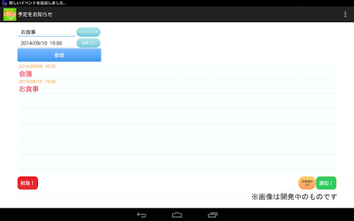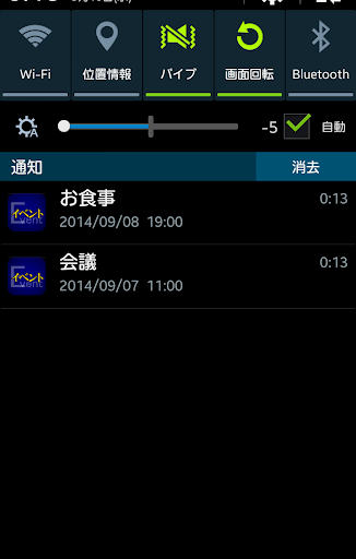 イベントの名前と時刻を入力して登録ボタンを押すだけで、通知バー・ステータスバーにイベントが表示されます。