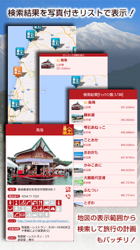 本アプリは、国土交通省(東北)に登録されている道の駅駅の情報を検索する事が可能です。