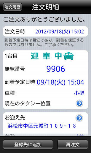 5.タクシーの手配が完了した時点で、タクシーの無線番号、到着予定日時をお伝えします。これで注文は完了です。