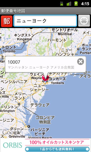 地図から任意の場所にピンを置くことで、その地域の郵便番号が分かります。