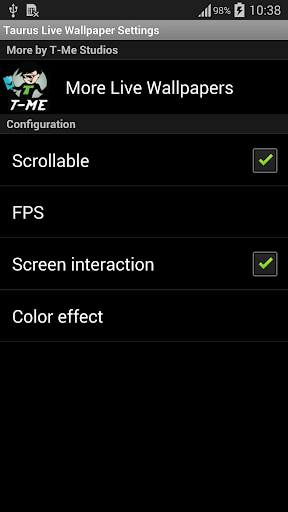 您可以增加元素的大小、速度,或者密度,还可以选择三种不同的颜色效果和三种不同的颜色强度。若要自定义,打开应用,点击“设置Live Wallpaper”,然后点击“设置”