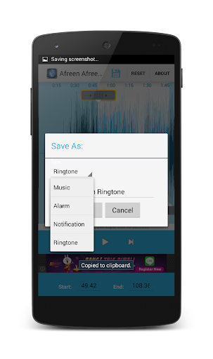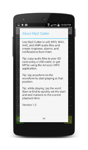 ☆設置開始和結束點的音頻文件中的一個片段,使用可選的觸摸界面。 ☆播放音頻的選定部分,其中包括一個指示器光標,並且波形的自動滾動。 ☆播放其他地方通過點擊屏幕上。