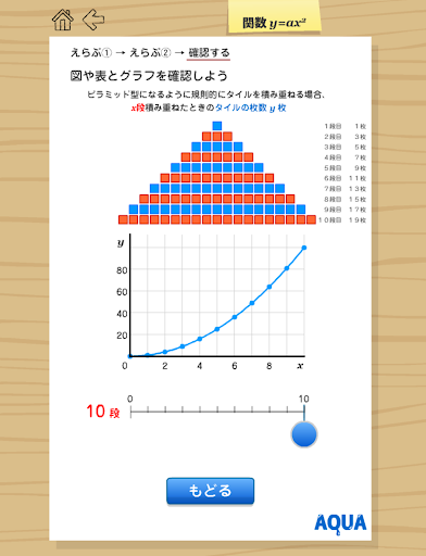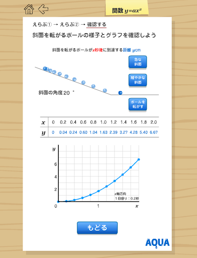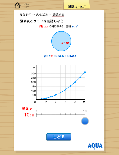 このアプリは中学3年生の「関数y=ax2」が学べるアプリです。「AQUAアクア」シリーズの全アプリを簡単に呼び出すことができる「総合メニュー」を合わせてご利用いただくと便利です。