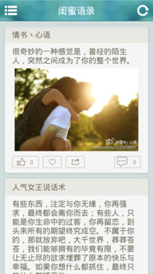一段话,一张图,一份情感,每天陪你说说闺蜜私房话。我们关注:√心情√服饰√感悟√女性√星座√八卦√减肥√潮流,我们是爱生活、独立自尊、见地独到的Girl!这里是属于我们自己的闺蜜语录。