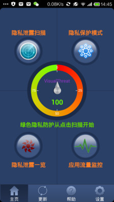 “隐私警示宝”使用1到100的分数来标识您的手机的安全认证分数(Mobile ThreatCert)。隐私数据泄露越少,安全分数就越高。