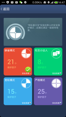 “隐私警示宝”是VisualThreat安全公司免费发布的一款扫描手机应用中隐私泄露风险的软件。它会向用户预警其手机上安装的软件和流量是否有隐私泄露隐患,避免个人隐私乃至银行账户信息遭到窃取。不仅如此,隐私警示宝还为您提供4套灵活的隐私泄露保护模式:缺省模式,社交小达人,宽松模式和严格模式,使得您能随意切换不同的保护模式来满足不同的手机使用场景。