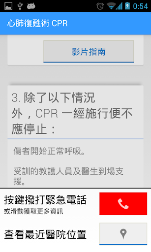 隨身急救指南清楚列出每個步驟的細節及注意事項,還提供快速撥打緊急求助熱線及查找最近醫院功能按鈕。