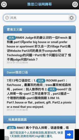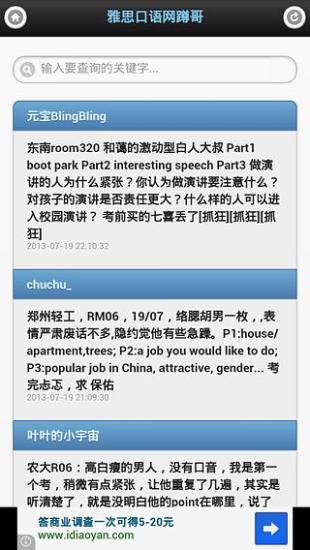 雅思口语网蹲哥每天蹲守在全国各地雅思考场、新东方、环球雅思、人人网雅思哥第一线,10分钟内转发全部考生分享的雅思口语题目。给烤鸭们提供最及时的口语资料。 雅思口语网蹲哥提供的内容:IELTS考试时间、考点、Room、Part1、Part2以及复杂的Part3题目,考生只需搜索到自己的考场,则考试Topic命中率则大大增加。 雅思4个7不再是遥远的梦想,拜七喜吃八喜,不如下载雅思口语网蹲哥。 大家一起分享考场回忆,新浪微博@雅思口语网蹲哥,众志成城,必过雅思!
