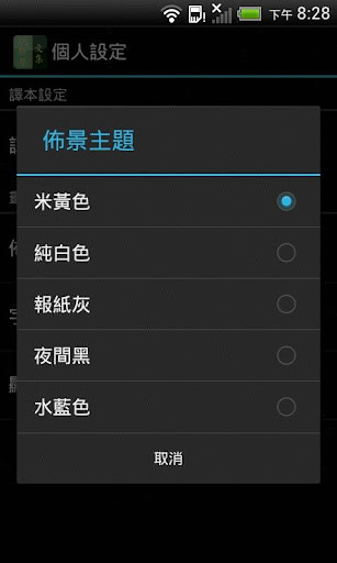 - 設定佈景主題(五種:米黃色、純白色、報紙灰、夜間黑、水藍色)。