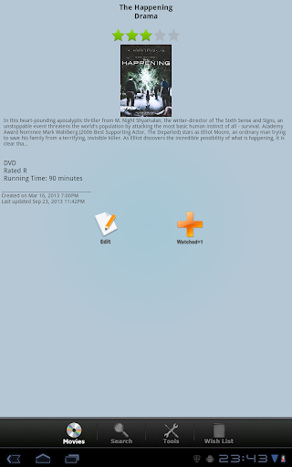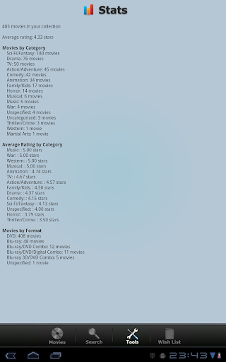 您是否擁有了很多的電影?你有麻煩保持跟踪您所有的DVD和藍光光盤?電影愛好者,跟踪你的電影收藏這個組織者。管理你的電影目錄以及個人等級和注意事項,您可以與他人分享或保密的。檢查你的電影已經擁有,而你出去逛街這樣你就不會意外地買了DVD或藍光光盤您已經擁有。閱讀電影評論,其他人已經共享。曲目附加信息,如借出狀態,位置,次數看,等特點•使用大容量條碼掃描選項,輸入你的電影通過快速掃描的條形碼上的影片例您的手機。 •備份您的電影收藏信息到服務器。如果丟失手機或升級到新手機,只需輸入您的集合到新的電話,讓您不必重新輸入所有。 •如果影片的封面圖片是不自動找到,使用照片功能,把你自己的照片用手機的攝像頭•導出您的電影收藏資料以CSV格式保存到手機的SD卡或通過電子郵件發送給自己。 •跟踪統計信息的收集喜歡你的電影總數的電影,平均評分,最受矚目的電影,電影的數量在每個類別。 (注:這個程序是不是一個電影播放器,不下載電影,它是用於管理物理電影收藏。)最近更新 - 增加按鈕,報告不正確或電影封面說明(!) - 設置默認的電影格式目前正在工具=>設置。 (添加新的電影總是默認為 DVD或藍光格式,如果這是設置) - 新字段的位置(即轉盤 4或家庭房架) - 固定空分類下拉錯誤 - 增加了HD-DVD/DVD組合以格式上變化 - 增加了編輯類別 - 固定排序忽略“的”或“A”和大小寫 - 增加了能夠添加條碼數據庫,如果沒有找到 - 修正發布到Facebook - 改進的隨機選擇 - 修復了平板的用戶界面 - 修復崩潰散裝刪除 - 增加了家庭電影,武術,和靜音分類 - 增加了英國電影評級(U,12,15,18)