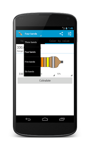此应用程序计算出的频带的颜色的基础上的一个电阻和公差的值,或从用户输入的值,可以显示颜色波段和宽容性。