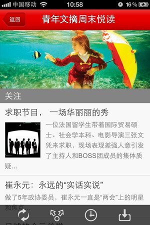 青年文摘移动客户端是青年文摘杂志社推出的一款为手机用户量身打造的免费阅读软件,客户端汇集青年文摘杂志社旗下《青年文摘-快点》《青年文摘手机报》《青年文摘》《青年文摘彩版》等杂志菁华,以及部分未见诸杂志的全新内容,为手机用户打造乐趣与深度并重的新阅读。