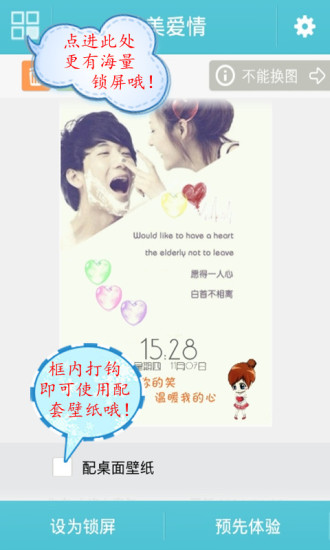 非主流动态壁纸锁屏软件内有多张唯美爱情壁纸随时随地自由切换哦!只需轻轻一点设为锁屏,手机顷刻变身花样美机哦!此锁屏还包含以下功能:1、随机切换,每次开屏展现不一样的锁屏样式;2、快捷工具,锁屏上滑,数据流量、wifi、手电筒、清内存,一键搞定;3、音乐播放器,丝般顺滑;4、双重加密,九宫格密码搭配数字密码,安全有保障。还在犹豫什么,快快行动下载这款万能锁屏吧!