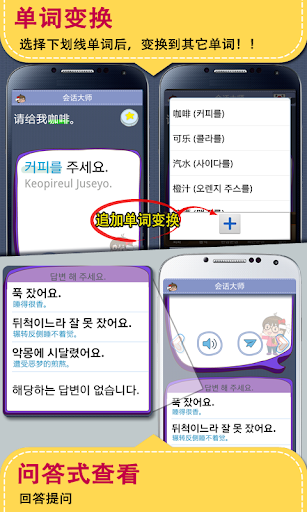 现在在饭店,大街上,海外旅行时不再害怕外国人跟你打招呼,每个会话里边预想的答案,变换文章内容而可以变换的状况练习等等功能的跨时代软件。