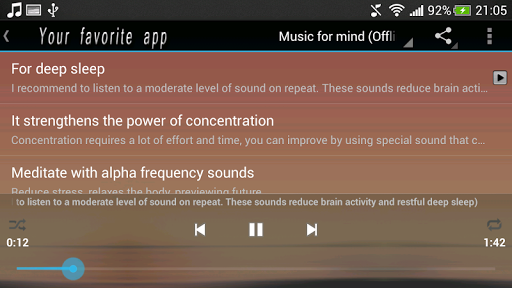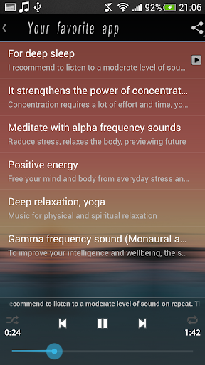 有了这个应用程序,您将享受高品质的声音体验内啡肽的奥秘,你会得到一个深刻的睡眠和休息,并随着时间的推移,你会提高你的生活方式。
