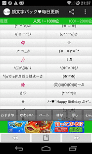 このアプリは、みんなが利用している人気顔文字を一覧で表示しますので、上位ほど以下な特徴をもった顔文字となっています。