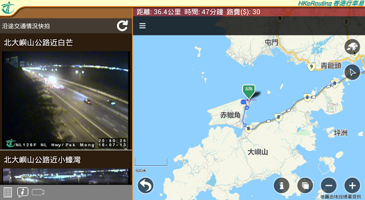 4. 搜尋結果以地圖顯示路線,並包括詳細路線資料、預計行車時間、距離和道路收費,以及提供沿途交通快拍、特別交通運輸措施和特別交通消息;