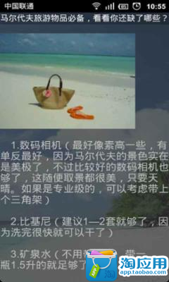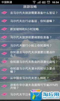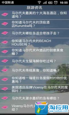 马尔代夫风景优美,是度假旅游的天堂。去马尔代夫旅游要准备些什么?有什么禁忌?有什么好玩的项目?所有关于马尔代夫旅游的问题本应用为您详细解答。
