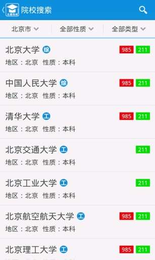 1、全国大学搜索,按地区,按类型,按性质搜索
