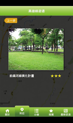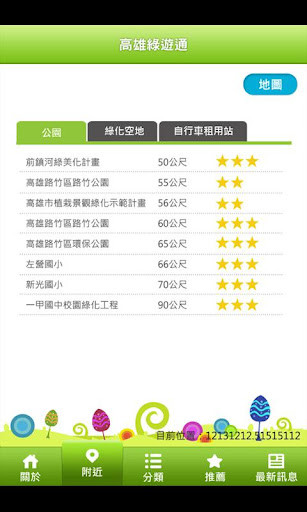 內容包含高雄市各區列為「空氣品質淨化區」的公園、綠化空地及自行車租賃站等位置資訊與推薦星等,並結合定位功能提供方向導引。