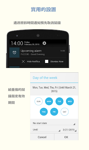 豐富的鬧鐘重複類型:指定日期,每天,星期,日期,每幾天,特定日組。對於重複的鬧鐘甚至可以指定有效期間。