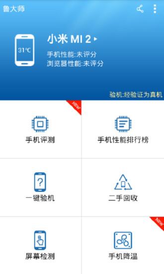 鲁大师安卓版是一款给安卓手机、平板进行性能评测、跑分的软件。通过八大测试,让你对爱机了如指掌。1、查看整体和单项硬件的性能得分,通过分数判断各硬件的性能。2、可查看本机操作系统的详细信息,包括SD卡容量,CPU型号、频率,系统版本号等多项信息。3、可上传分数并查看排名,通过排名查看分数高的机型,也可查看当前手机的排名位置。4、html5测试,支持跨平台性能测试,Android可以和iOS设备PK。5、支持把手机流量wifi共享给其他无线设备。6、超强手机真伪鉴别功能,让山寨高仿无处遁形。7、可以查看市面上所有安卓手机平板的配置。