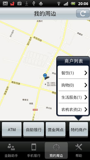 7、我的周边:本行营业网点查询、ATM查询、自助银行查询、电话自助终端、特约商户地图查询,更可通过GPS查找您身边的网点;