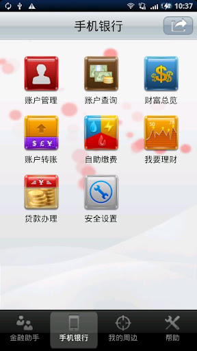 手机银行为您提供了8项业务功能,包括账户管理、财富总览、转账汇款、理财业务、缴费业务、贷款业务、安全设置等,您能够随时享用金融服务。更有“金融助手”服务,您无须登录,即可轻松查询最新、最适用的本行金融资讯,使您随手掌握市场动向,时时积累财富。