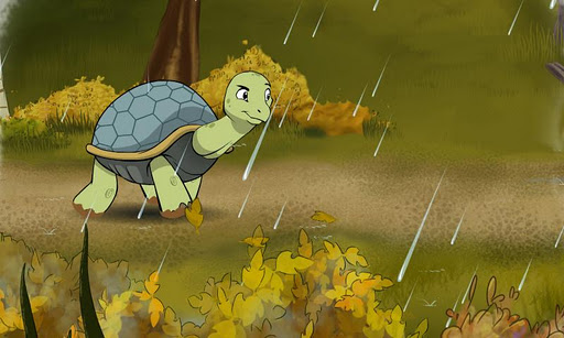 "风不停地吹着,雨也不停地下着。逐渐的,地面被深深的、泥泞的水坑所覆盖。而乌龟并没有放弃。他迈着缓慢而坚定的步伐,不断地向前走着。"