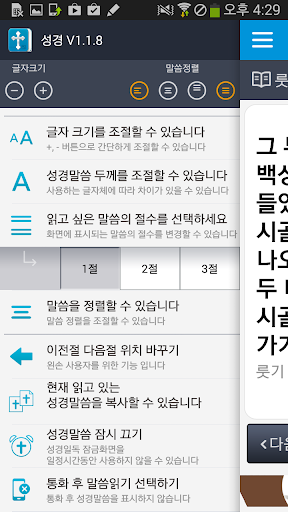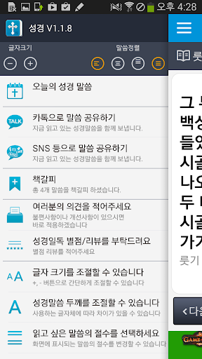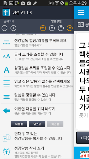 2. "읽었음" 버튼을 눌러 한번 읽게된 절은 자동으로 기억하고 다음에 폰을 켤때 다음절로 이동합니다.
